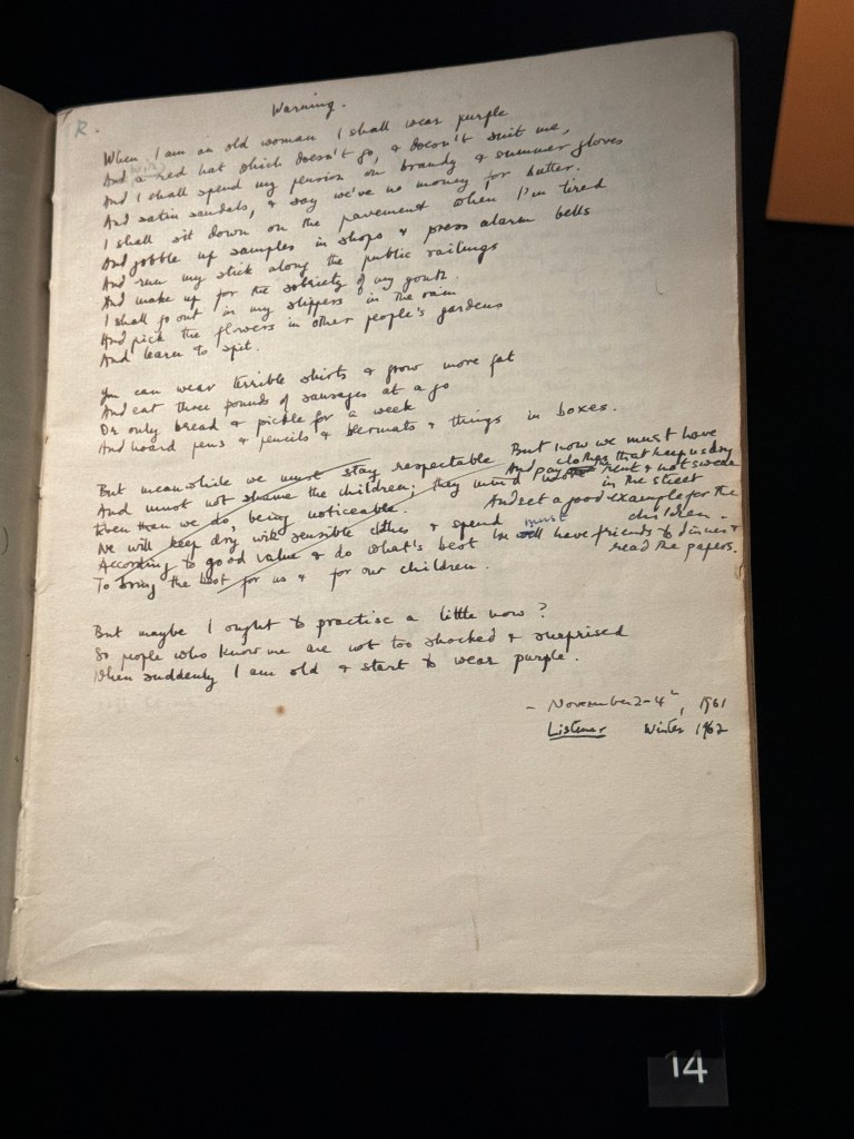 I wanted to wonder more at Bruce Chatwin’s famous Moleskin notebook (a bit bigger than I’d imagined and with messier handwriting. Or lose myself in George Eliot’s immaculate copperplate in a miniature notebook beside it, making observations from her journey in Italy. Or ponder on the comma removed by Joyce from the first page of A Portrait of the Artist for the second edition in 1917. Or Jenny Joseph’s correction of her much-loved poem “Warning”, with a rather too respectable verse about respectability that was replaced by something much more lively.