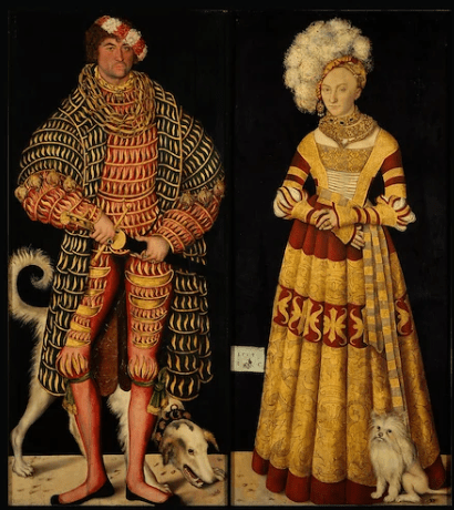 Lucas Cranach’s matching portraits of Henry IV of Saxony and Catherine of Mecklenburg, showing the new fashions both for full length portraits and for clothes cut to show the expensive silk peeking out from underneath.